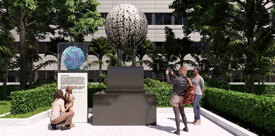 这是三院的研究学者发现的塞卡病毒雕塑标本,为纪念这一重要发现,我们进行了包装,提升了仪式感