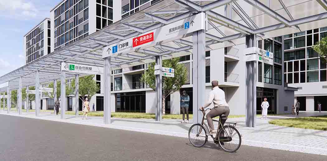 就是贯穿医院建筑的地面连廊,我们重新提出了改造方案,使之变得更加艺术性,成为院内靓丽的一道风景线